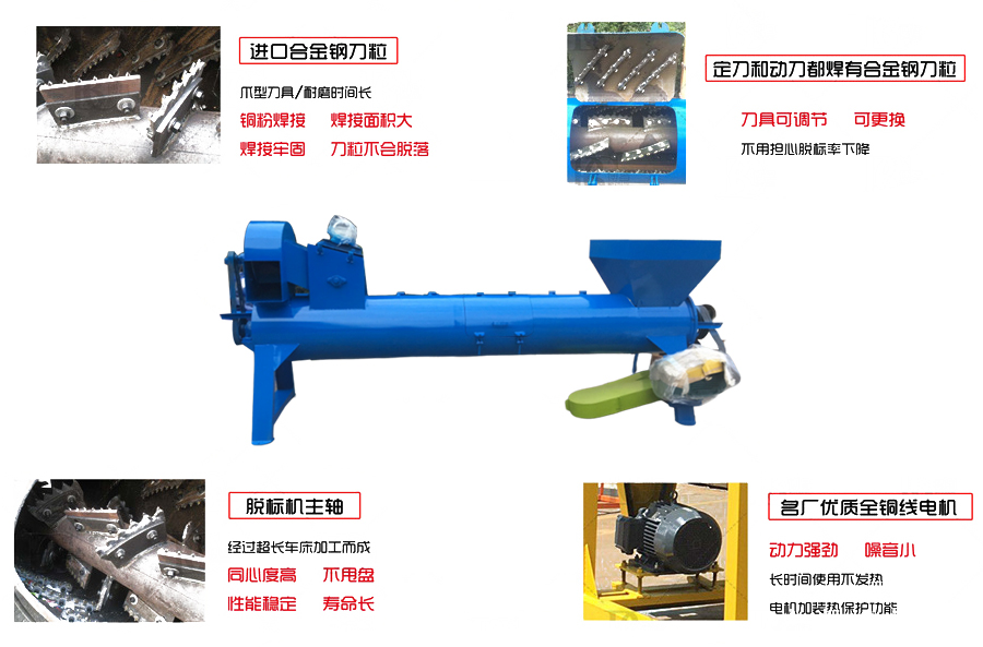 將PET塑料瓶料輸送至脫標機入料口,脫標機身前部有一段螺旋推送,將瓶推至脫標段。經過主軸旋轉的動刀與筒壁上固定的定刀進行螺旋式的磨擦,使標簽紙掉落,出口處有離心旋風式設計分離室,將剝離的標簽與PET瓶身分開,標簽紙從頂部的標簽出口處吹出,PET瓶通過主軸的旋轉螺旋推送從另一側出來。還可依據瓶體的大小不一,對主軸合金刀片和內壁刀片的間距進行靈活調節。合理避免了刀片對瓶身的劃傷,讓生產廠家產出的瓶片質量更好,賣出更高的價格。
