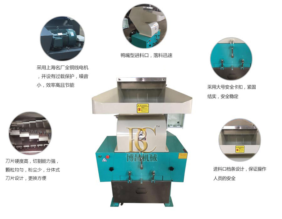 可用于箱類、薄管件、吹塑件、瓶、殼、板、罐、生活塑料用品等所有廢舊塑料的再次粉碎回收或作為注塑機(jī)的輔助機(jī)器對注塑機(jī)水口料或次品件進(jìn)行重新粉碎利用。
